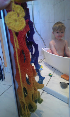 Mens Stoffer hygger i badet (ja vi har rigtig ferie og ting tager riiigtig laaaang tid her hos os...) hækler jeg på en hue jeg fandt på pinterest. Det er oldemor firkanten i ny udgave. Laver den i kauni så den passer til et fantastisk tørklæde jeg fik af min svigerindes mor. Det er så skønt og lige i de farver jeg ELSKER...